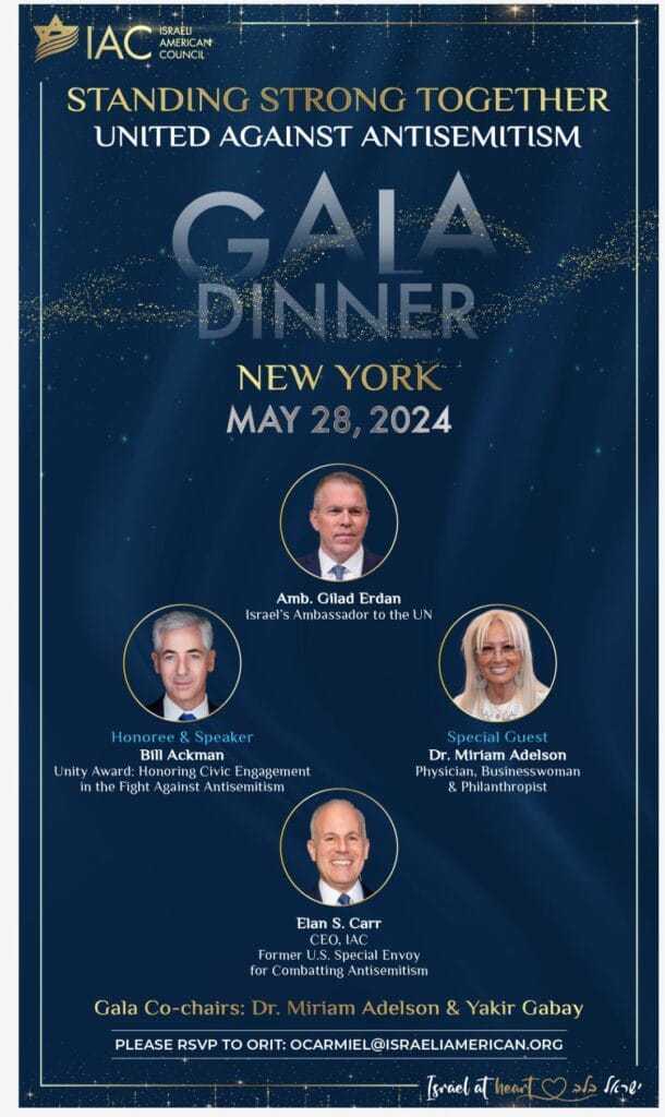 Join us for an evening of inspiration, philanthropy and unity along with special guests, Amb. Gilad Erdan, Israel’s Ambassador to the UN, Dr. Miriam Adelson, Physician, businesswoman and philanthropist, Elan S. Carr, IAC CEO and former U.S. Special Envoy for Combatting Antisemitism, and honoree and speaker Bill Ackman, recipient of the Unity Award: Honoring Civic Engagement in the Fight Against Antisemitism.