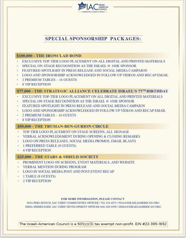 The IAC is a 501(c)(3) Tax Exempt Non-profit, EIN # 22-3951652, doing business as Israeli-American Council. The IAC did not provide the contributor with goods or services in connection with his/her gift. This information complies with IRS reporting requirements and is accurate.